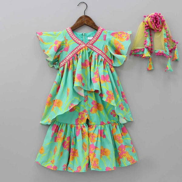 Vibrant Blossom Ensemble: Multicolor Floral Full sleeve tops with Sharara And Matching Dupatta 1904